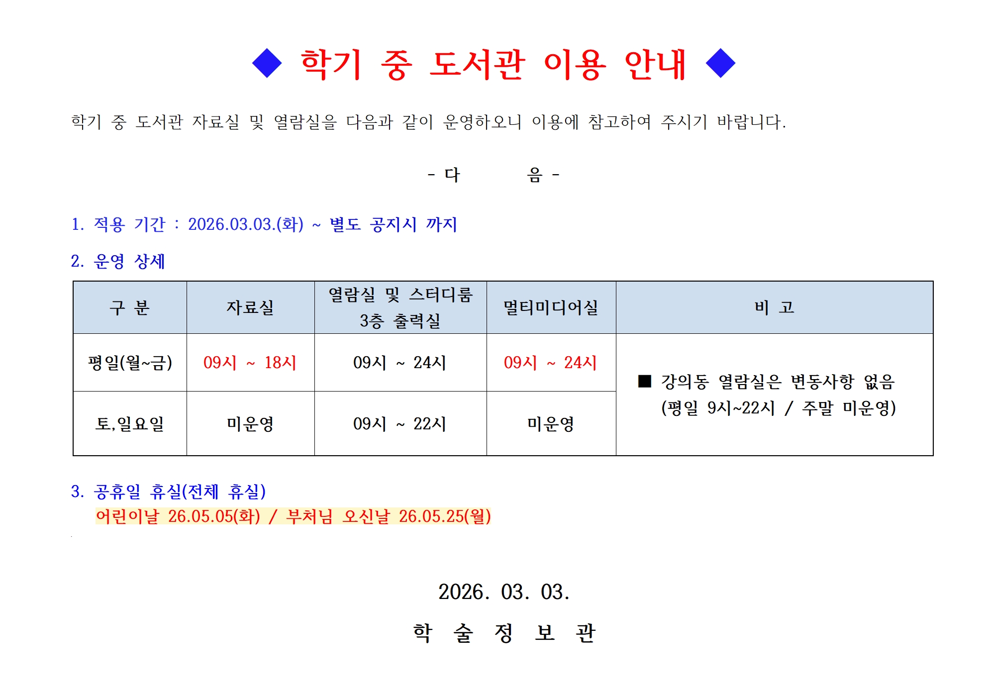 학기 중 도서관 이용 안내